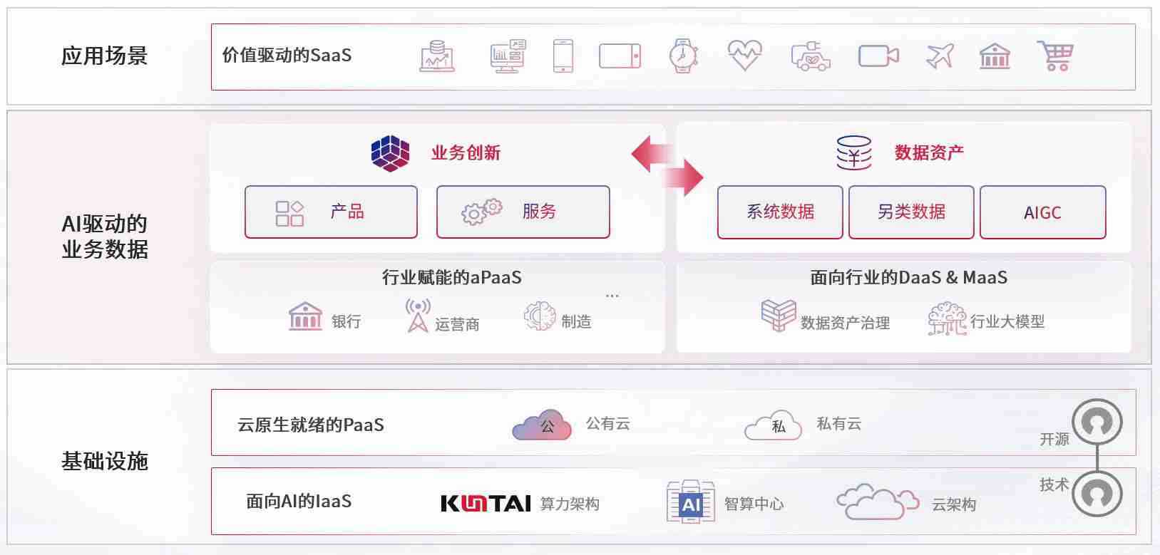 数字时代,,围绕企业数字化转型的关键要素,,壹号娱乐数码开创性的提出数云融合战略和技术体系框架,,,,着力在云原生、、数字原生、、、AI原生和信创产业上架构产品和服务能力,,为处在不同数字化转型阶段的快消零售、、、、汽车、、、金融、、、医疗、、、、政企、、、教育、、运营商等行业客户提供泛在的敏捷IT能力和融合的数据驱动能力,,构建跨界融合创新的数字业务场景和新业务模式,,,助力企业级客户建立面向未来的核心能力和竞争优势,,,全面推动社会的数字化、、、、智能化转型升级。。